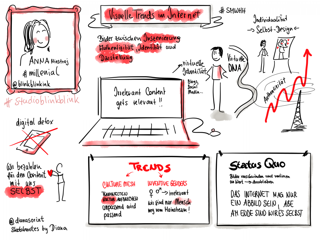 Bei dieser Gelegenheit möchte ich gerne die Arbeiten von Ania Gross, die kurz zuvor meinen Workshop besuchte, vorstellen. Gleich nach meinem Speed Crashkurs hat sie losgelegt und alle Sessions, die sie besucht hat mit gesketched. Ich war unglaublich beeindruckt über ihre Ergebnisse. Hier ist ihr Blogbeitrag zur Social Media Week und ihre fantastischen Sketchnotes zu sehen: Unbedingt reinklicken!