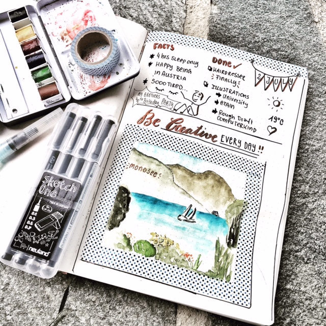 Diesen Sommer war ich nun mal viel unterwegs und habe einerseits meine To Do Listen, aber ebenso Anleitungen, Bilder der Landschaften und verschiedene Gedanken in meinem Bulletjournal festgehalten. Das ist manchmal einfach nur ein schöner Spruch in Form von Brushlettering, oder eine Einkaufsliste bis hin zu Erste Hilfe Tips im Falle eines Bienenstiches in Form einer Sketchnote. Und jede Seite hat eine Geschichte. Und da steht eben nicht, meine Tochter ist auf eine Biene getreten sondern ich habe einfach mal die Erste Hilfe Tips (natürlich nachdem ich sie erst versorgt habe) visuell umgesetzt. Das macht nicht nur Spass, sondern bietet doch irgendwie auch einen Mehrwert. Zumindest war dieser Post der einer der erfolgreichsten bislang auf Instagram! Eine kleine Auswahl seht ihr hier und im Youtube Video alles komplett!Material für dein Travel Journal