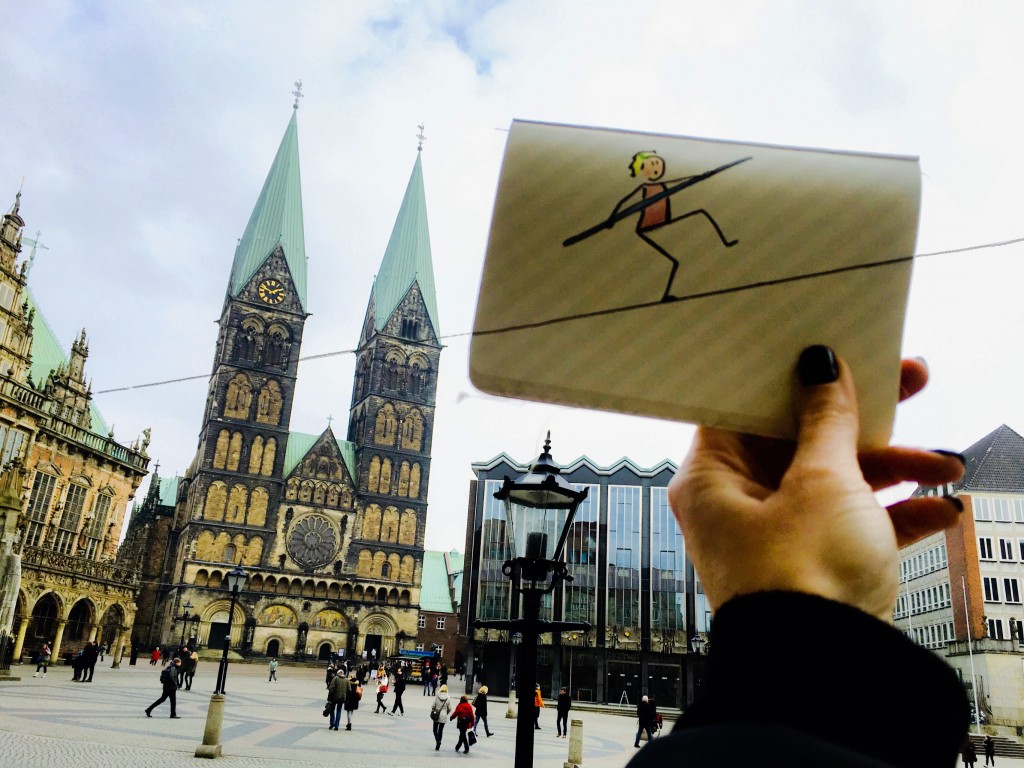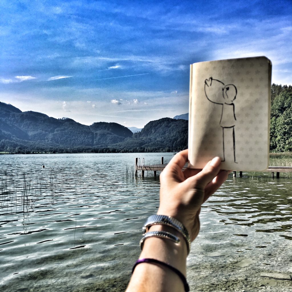 Und was ich immer in meiner Handtasche mitführe, sind verschiedene kleine Notizbücher. Ich kaufe sie spontan, wenn ich zufällig schöne entdecke. Da kann mich dann gerne auch erst mal das Cover ansprechen. Ich benutze sie am liebsten auf Reisen. Ich schreibe beispielsweise den Namen der Stadt oder der Region auf und fotografiere es dann mit Landschaft oder einem besonderen Motiv im Hintergrund. Oder ich füge Zeichnungen – na ja meine Strichmännchen – hinzu und versuche sie in das Hintergrundbild zu integrieren. Das macht Spass und ist immer eine sehr schöne und persönliche Erinnerung.