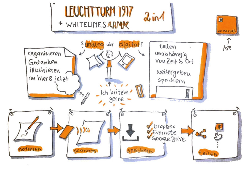 Die Anschaffung des Whitelines Paper Produkten lohnt sich sicherlich, wenn man rasche Notizen und Sketchnotes erstellen möchte und keinen allzu großen Anspruch an künstlerische Werke, beziehungsweise an die jeweiligen Farben stellt. Und bei Sketchnotes geht es ja nicht um Kunst, sondern um Ideen, das wissen wir ja alle mittlerweile. Um Notizen am effektivsten zu digitalisieren, um sie zu verschicken und zu teilen und man nicht gerade mit seinem Tablet zeichnet, ist diese Form von 2in1 absolut zu empfehlen.
